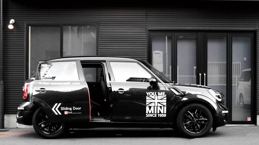 MINIクロスオーバーの右後部ヒンジドアをイタリア・KIVI製スライディングドアユニットを導入してスライド化。